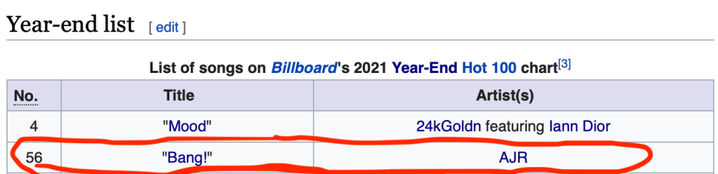 The thing I can say about other bands known for being bad is that, as much as I dislike them, they at least have something positive I can say about them. Take a look at the bands I went over today. The Foo Fighters and The Offspring have tons of great singles between the two of them. You can skip the songs I went over today and proceed directly to their 90’s and 2000’s back catalogs. Three Days Grace and Papa Roach have released some songs I enjoy, specifically “Animal I Have Become” for the former and “She Loves Me Not” for the latter. Machine Gun Kelly’s latest charting song was his best so far, so maybe he’ll figure this whole rock music thing out. I’ve heard good things about A Day To Remember’s previous material, at least better than whatever “Everything We Need” was. And even Five Finger Death Punch… there are several earlier songs I unironically like by them, particularly “Far From Home” and “Hard To See.” It was several albums within their career when they went completely off the rails. But with AJR… I can’t name a single song by them that I like. I’ve listened to all their hits. Didn’t like a single one of them. I’ve listened to The Click front to back. Didn’t find a song I rate higher than a 5/10. Heck, you know “Sober Up,” their breakthrough hit and one of their most-mocked songs, complete with the line “my favorite color is you?” Well, that is, by far, the best thing I’ve heard from them so far. It was the only single I’ve heard from them that sounded musically cohesive, and its bad parts were more nitpicky on my end than their other material. Heck, the worst part of the song was Rivers Cuomo of all people, who sang the “my favorite color is you” line and presumably came up with it. Other than that, it’s a complete washout. Oh, and speaking of Rivers Cuomo, you know Weezer had another of the five biggest songs of the year in Alternative music with “All My Favorite Songs,” right? It was a good song! The orchestra and mellotron added a new dimension to Weezer’s classic sound. Well, there is a second version of the song featuring AJR. I gave it a chance… and yet again AJR screwed it up by ripping out the orchestration and replacing it with drum programming and synths. Everything this band touches turns into crap.